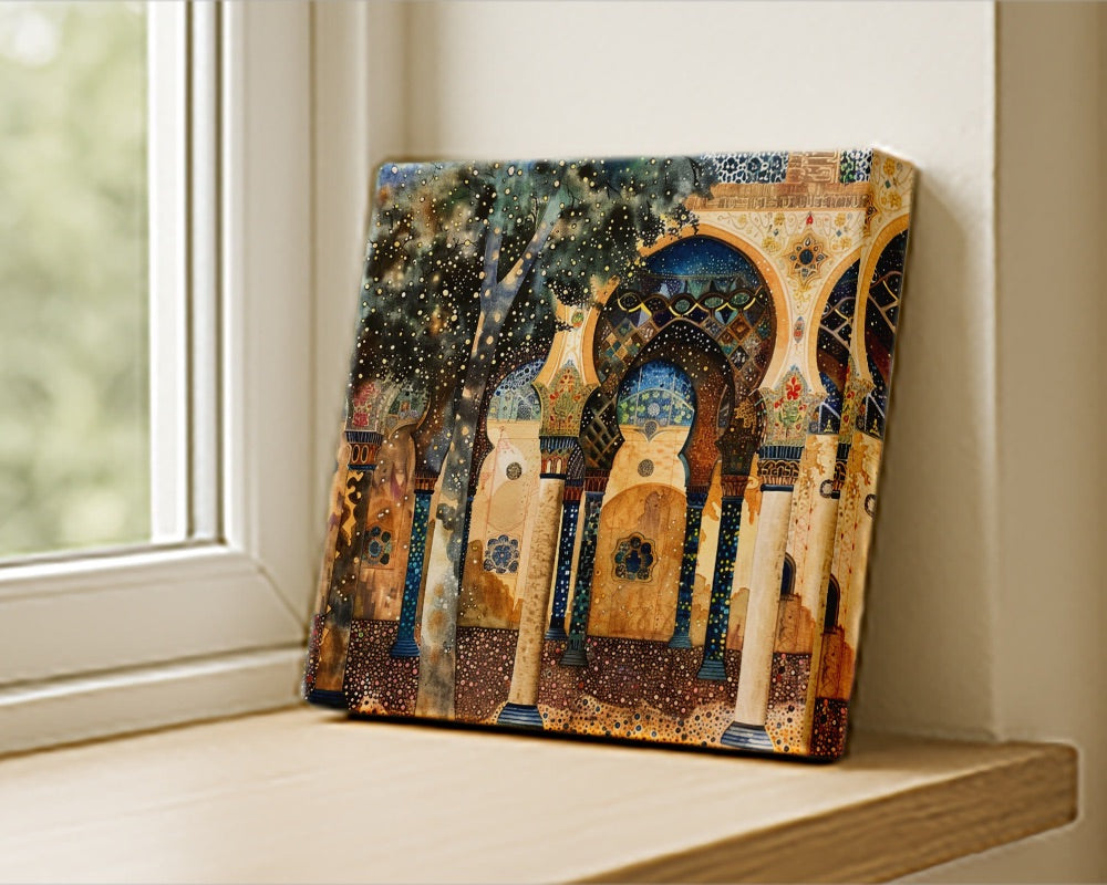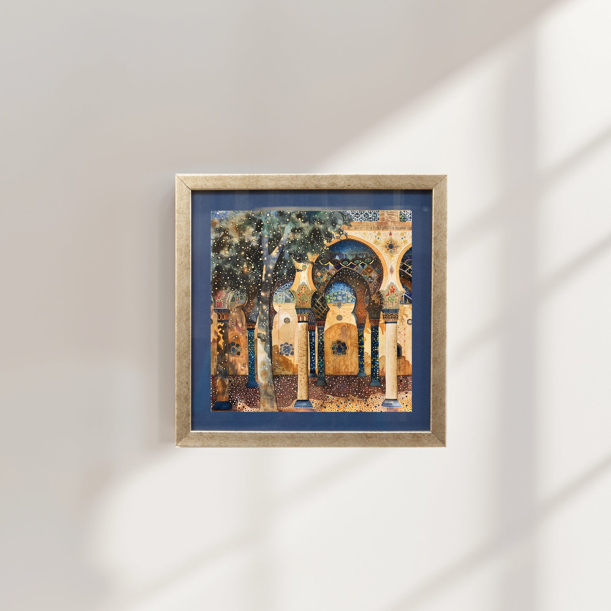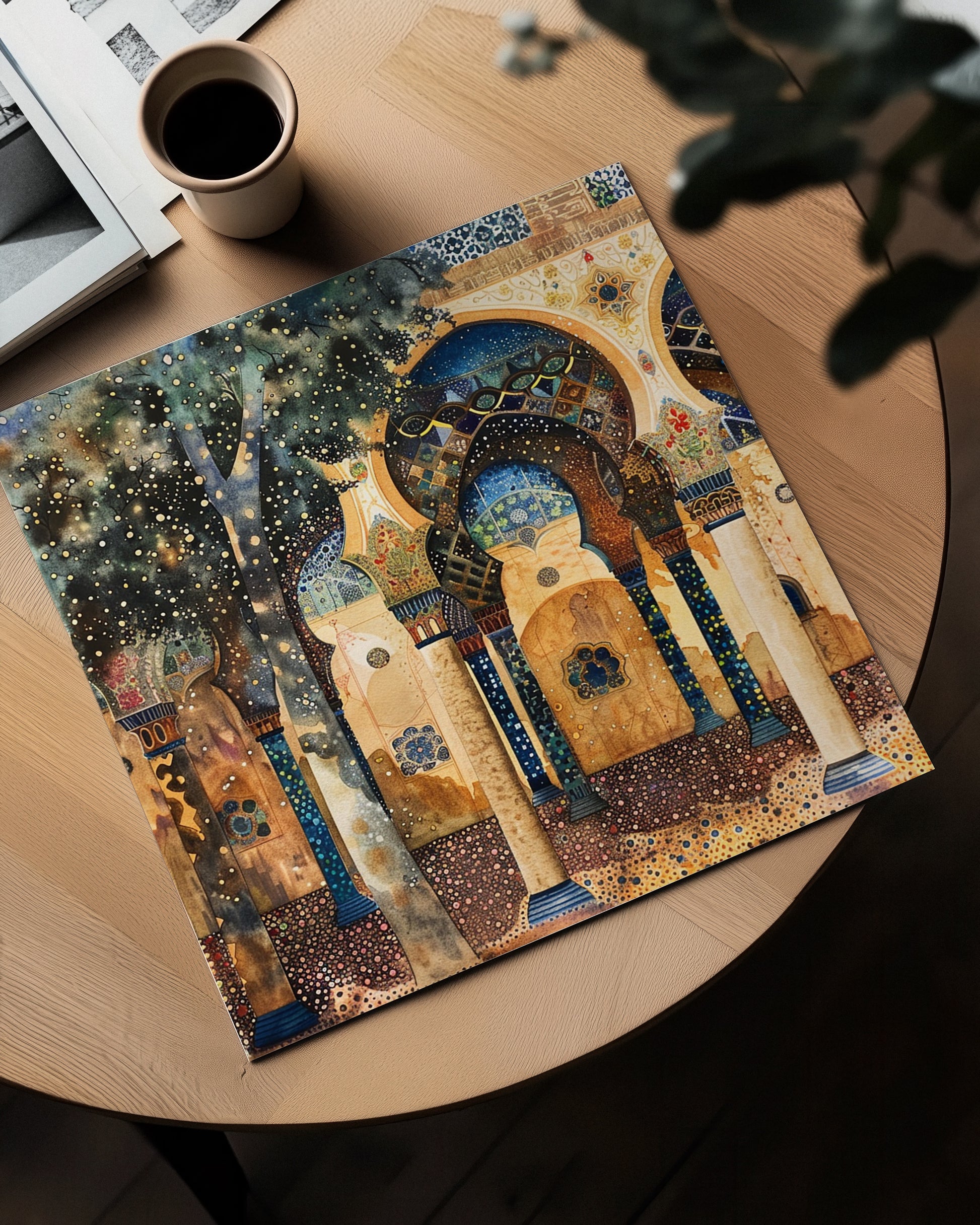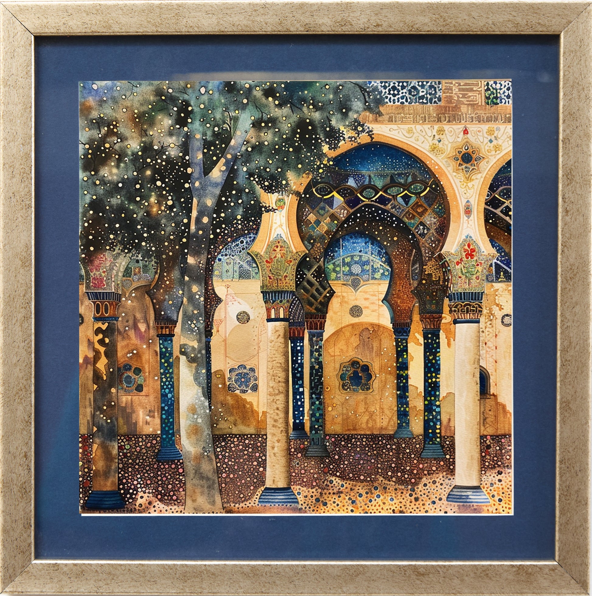 Ornate arches recede into infinite depths under a canopy of golden stars. This digital illustration captures the mesmerizing geometry of classical architecture—intricate tile work, carved columns, and graceful arches that create a hypnotic rhythm of light and shadow. A celebration of timeless design and architectural beauty.