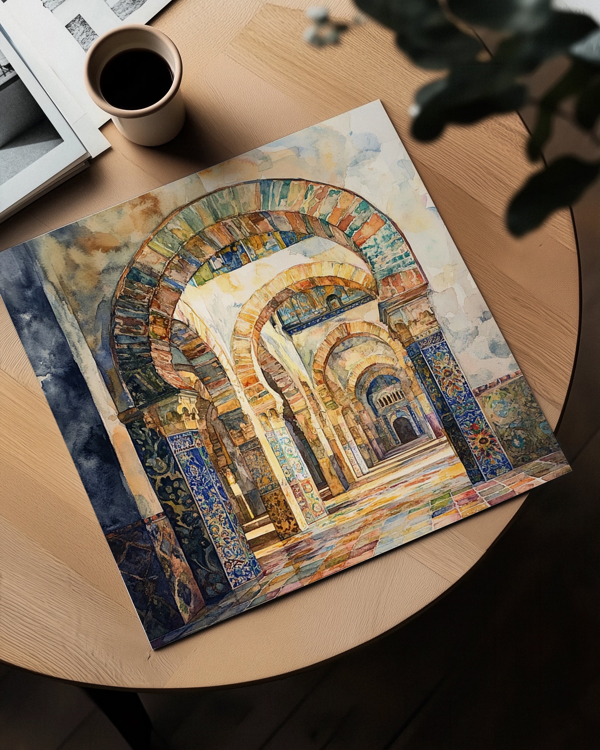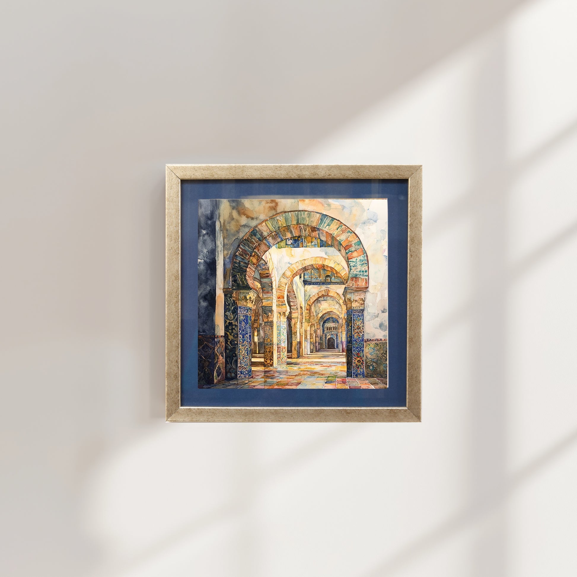 A watercolor dream of repeating arches in warm terracotta and cool blues, creating an endless corridor of light and pattern. This digital illustration celebrates the mathematical beauty of classical architecture, where geometric forms create meditative spaces. The soft, painterly style adds artistic depth to timeless design.