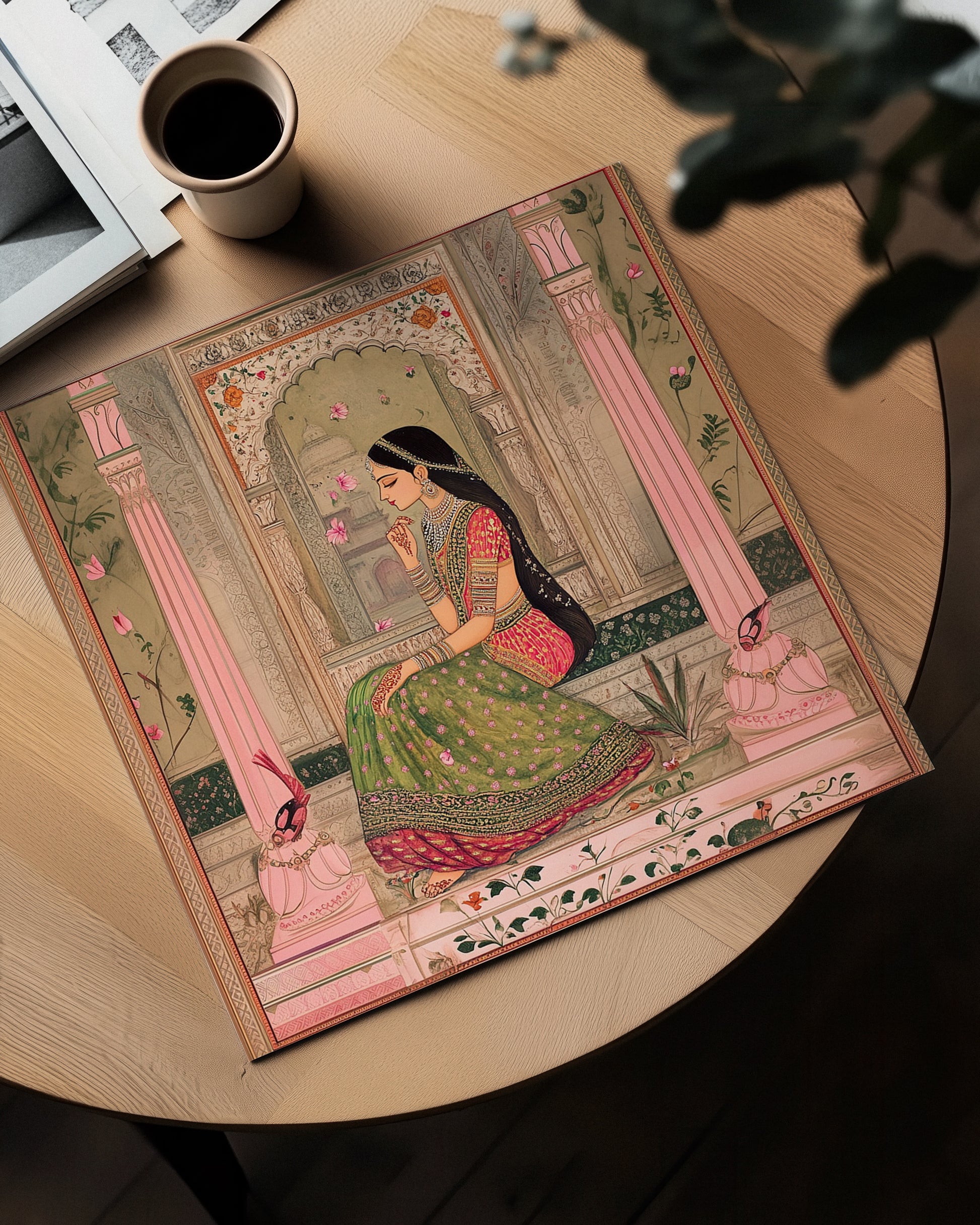 A Rajput princess in quiet contemplation, adorned in traditional jewellary and silk. This digital artwork blends classical Rajasthani miniature painting style with contemporary illustration. Soft pinks and golds create dreamlike elegance perfect for bedrooms, meditation spaces, or anywhere seeking calm cultural beauty.