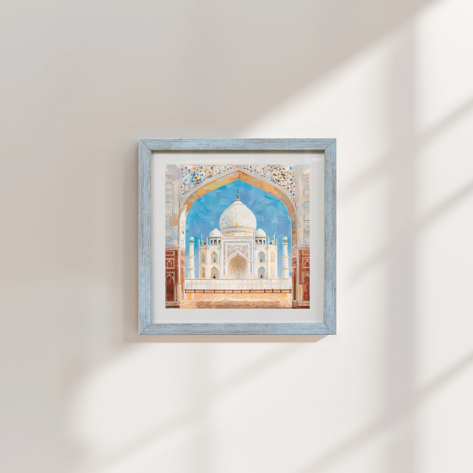 The iconic Taj Mahal framed by an ornate Mughal arch in this dreamy watercolor illustration. Soft washes of blue, gold, and terracotta capture the monument bathed in warm afternoon light. India's most beloved landmark rendered with artistic delicacy and architectural reverence.