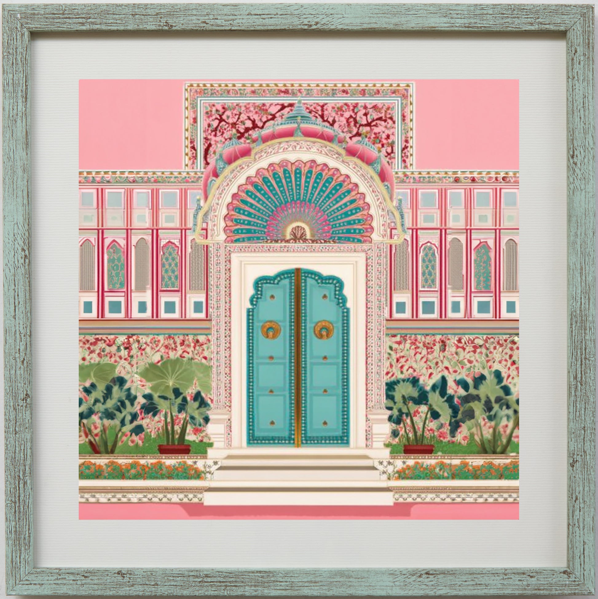 A breathtaking digital art print of a luminous teal door with gold studs set beneath a spectacular peacock-feather fan arch, flanked by floral-patterned palace walls and a lush garden in full bloom. Pink, teal and gold combine in a palette of pure royal elegance — an instant showstopper for any wall.